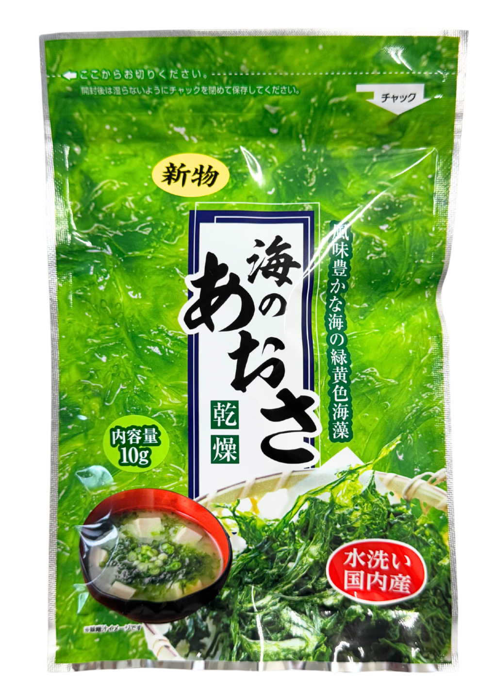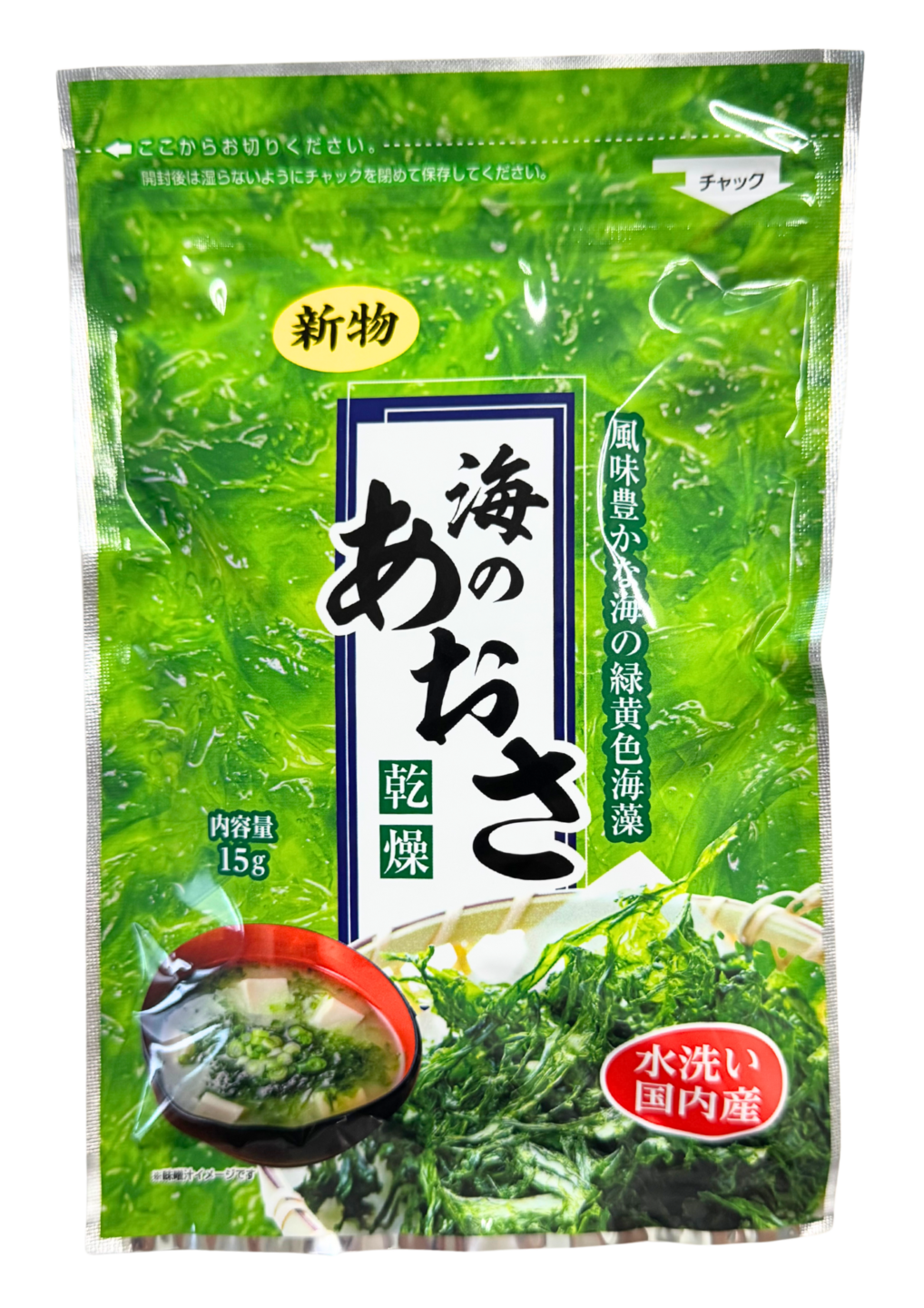 弊社の乾燥あおさはアルミ袋で光を防ぎ、チャック付き袋になっていますので、