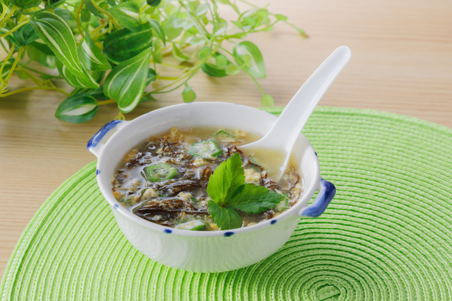 2. 鍋に調味料を入れ、沸騰したらもずくと輪切りしたオクラを入れる。
